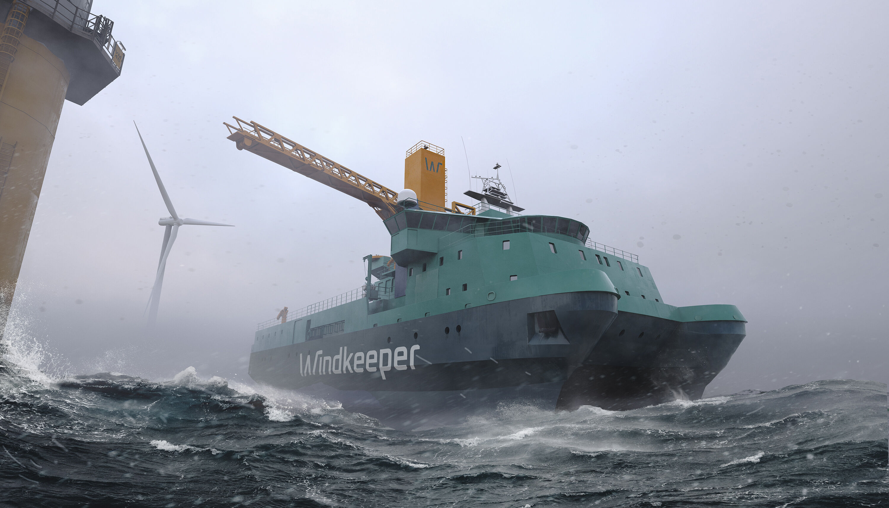 Das Doppelrumpfkonzept des Schiffs, ein sogenanntes Small Waterplane Area Twin Hull (SWATH)-Design, reduziert die Wellenreaktion deutlich und sorgt auch bei rauer See für außergewöhnliche Stabilität und Steuerbarkeit. In Kombination mit dem dynamischen Positionierungssystem (DP) bleibt der Windkeeper selbst bei Wellenhöhen von bis zu vier Metern sicher auf Position. Das ermöglicht einen geschützten und komfortablen Personentransfer über die bis zu 30 Meter ausfahrbare Gangway – und das auch unter anspruchsvollsten Bedingungen.