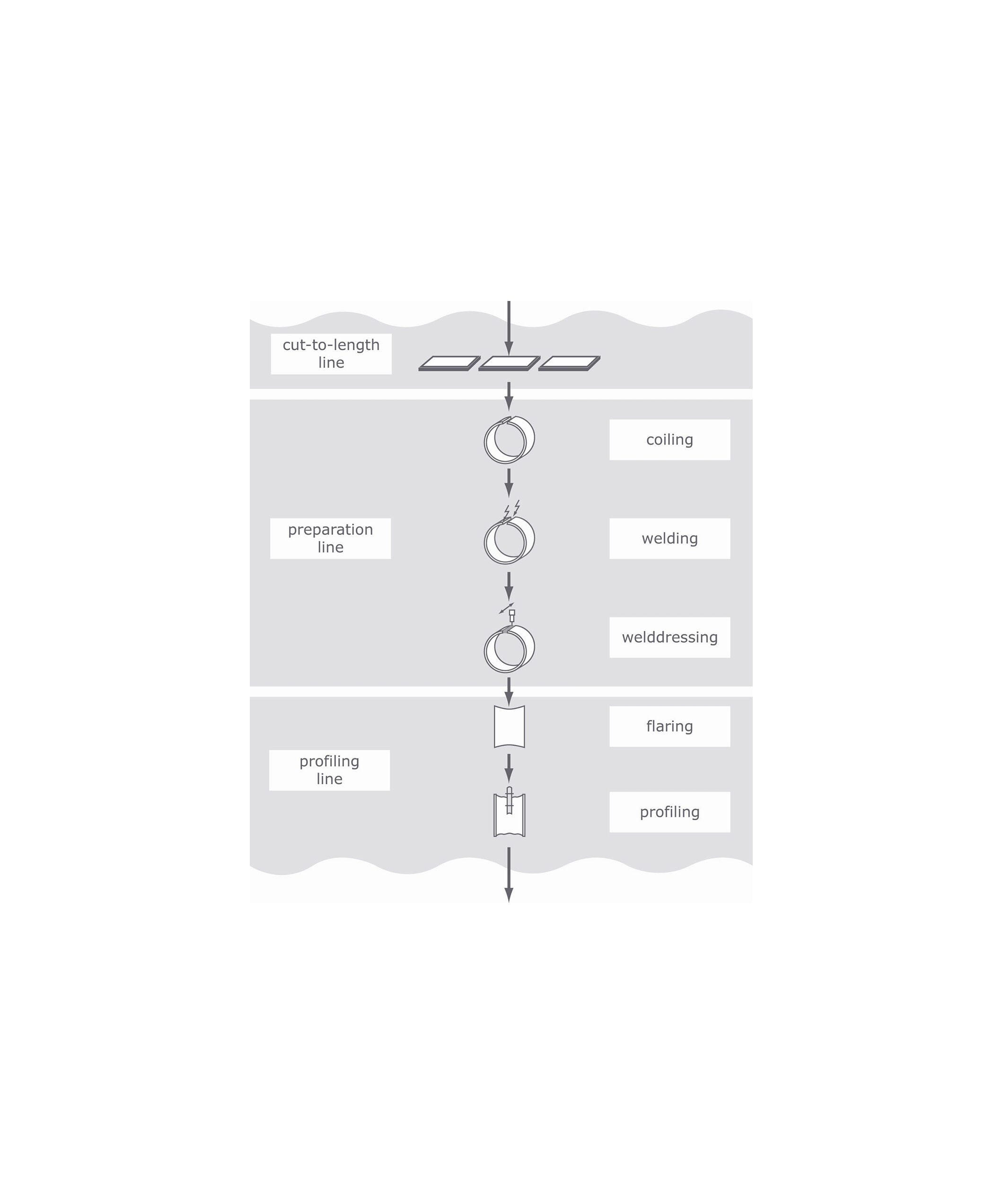 Im Produktionsprozess wird dabei zunächst das auf großen Haspeln angelieferte Stahlrohmaterial abgewickelt und auf Maß geschnitten (Zuschnittprozess). Daraus werden die zylindrischen Hohlformen produziert (Vorbereitungsprozess). In der darauf folgenden Linie werden die Rohlinge auf den benötigten Umfang geweitet und in die endgültige Form gebracht (Profi lierung).