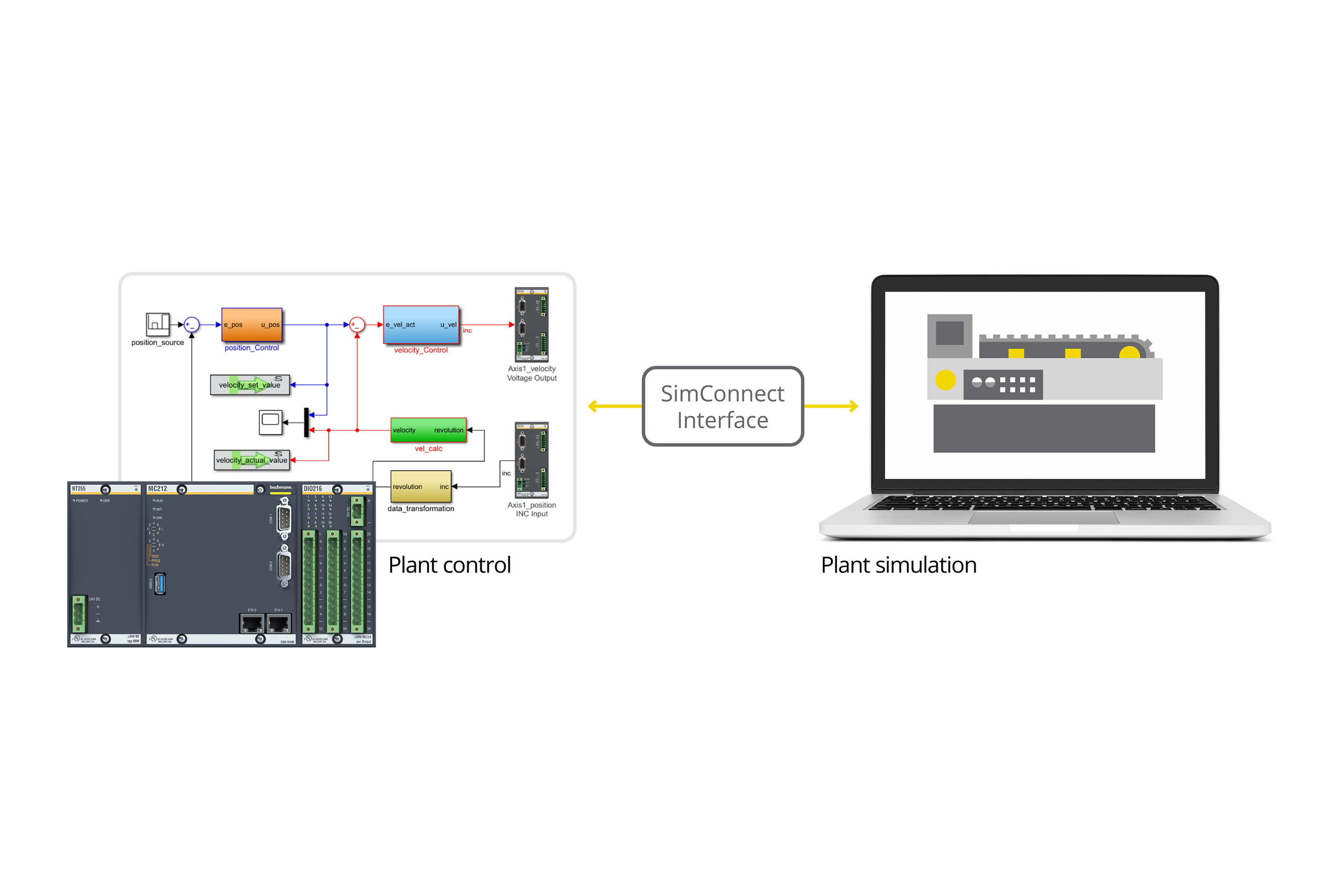 Suppliers of machine components are also increasingly providing simulation models, which are integrated into an overall plant simulation. Bachmann electronic offers the right solution with the current M-Target for Simulink Version 2.50. With the new SimConnect blocks, a co-simulation can be created in no time. The control code continues to be processed on the Bachmann real-time controller. From now on, however, parts of the plant simulation can also be executed on the engineering PC. This enables additional flexibility in the design of an overall test setup.