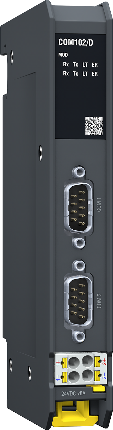 The COM102/D module for the backplane offers 2 serial interfaces. The standards RS-485, RS-422 and RS-232 can be selected as well as the baud rate and the handshake procedure. The interfaces can be used with the communication solutions for Modbus RTU/ASCII, IEC 60870-5-101 and -103 or DNP3. Customized protocols can be implemented in PLC and C/C++. Thanks to the native mapping of the COM ports in the operating system of the controller CPU, no fieldbus data points need to be considered in the application program. The LEDs on the module enable targeted diagnostics in the switch cabinet even without a PC.