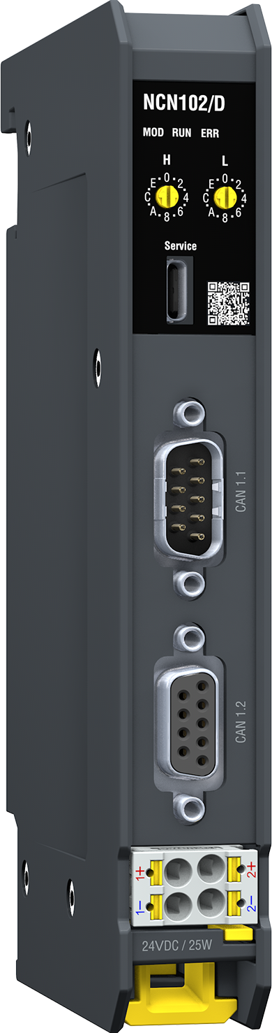 The NCN102/D node adapter maps the powerful and flexibly configurable M100 station to a standard CANopen interface. The operating modes of the M100 I/O modules are defined during the configuration and are transferred to the station during start-up. The CANopen synchronization features enable clock-synchronous sampling and processing of the I/O signals.
